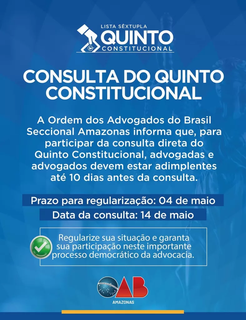 A Ordem dos Advogados do Brasil Seccional Amazonas informa que, para participar da consulta direta do Quinto Constitucional, advogadas e advogados devem estar adimplentes até