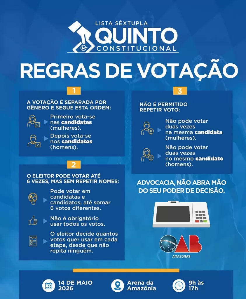 No dia 14 de maio de 2026, a advocacia amazonense tem um compromisso fundamental com o futuro da Justiça. A consulta para lista Sêxtupla do