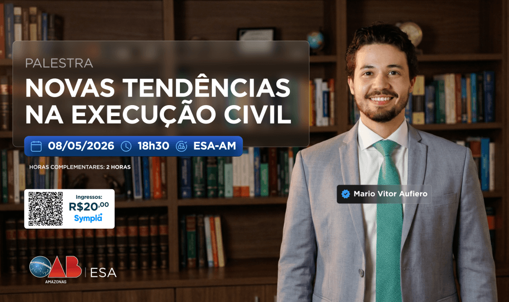 A OAB Amazonas, por meio da ESA-AM, promove a palestra “Novas tendências na execução civil”, ministrada por Mario Vitor Aufiero. 📅 Data: 08 de maio
