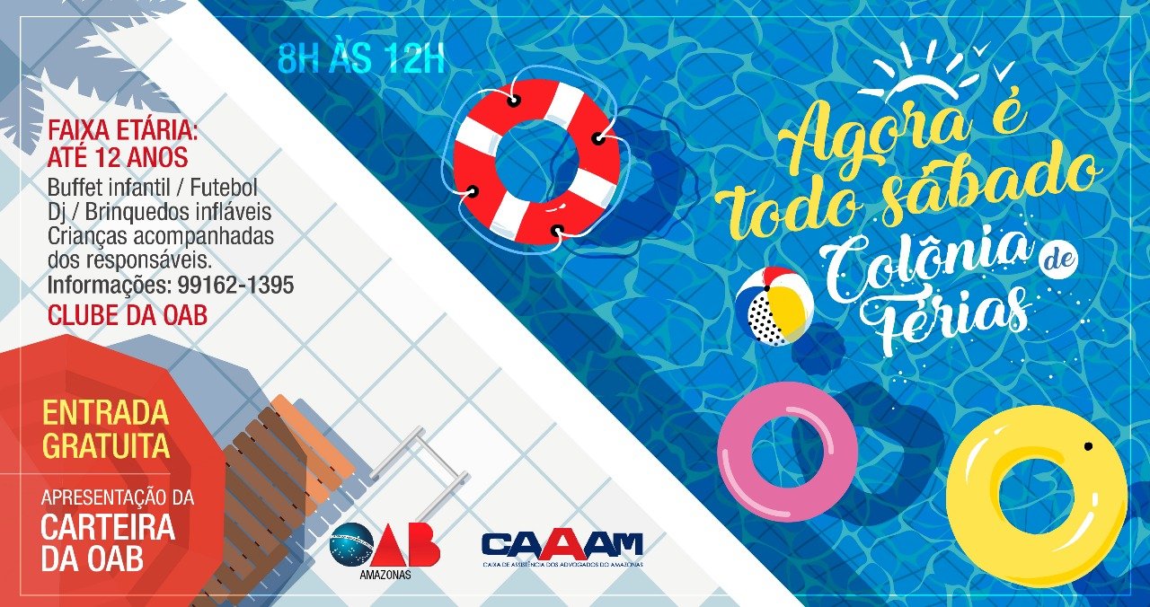 A Colônia de Férias do Clube da OAB-AM irá reunir neste sábado uma turma bem animada na sede social dos advogados. Brincadeiras, jogos, animadoras, brinquedos infláveis, futebol de sabão, dança, futebol no campo e música agitará a garotada.