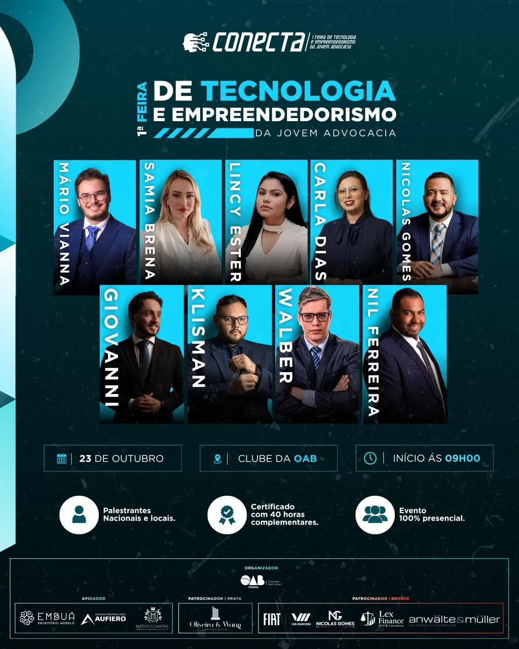 A Ordem dos Advogados do Brasil Seccional Amazonas, por meio da Comissão da OAB Jovem, realiza no dia 23 de outubro, a partir das 08 horas, no Clube da OAB, a 1ª Feira de Tecnologia e Empreendedorismo da Jovem Advocacia – CONECTA, um evento que simboliza o novo momento da advocacia amazonense: mais digital, estratégica e empreendedora.