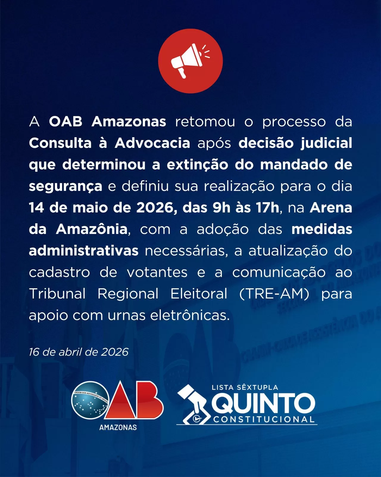 A Ordem dos Advogados do Brasil Seccional Amazonas (OAB-AM), sob gestão do presidente Jean Cleuter, informa que, após decisão judicial que extinguiu o mandado de segurança que suspendia os atos da Seccional e da Consulta à Advocacia, foi determinada a retomada do processo administrativo e a adoção das medidas necessárias para seu regular prosseguimento.
