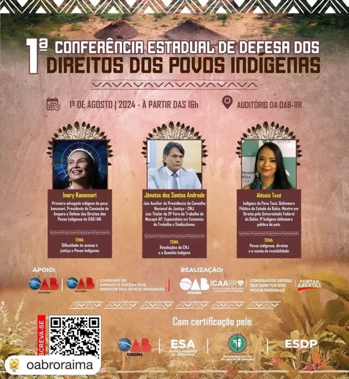 A Ordem dos Advogados do Brasil – Seccional Roraima (OAB-RR), por meio da Comissão de Defesa dos Direitos dos Povos Indígenas, em parceria com a Escola Superior da Advocacia de Roraima (ESA-RR), a Comissão de Amparo e Defesa dos Direitos dos Povos Indígenas da OAB-AM e Escola Superior da Defensoria Pública do Estado de Roraima (ESDEP-RR), realizará no dia 1º de agosto de 2024, com início às 16h, no auditório Hesmone Saraiva Grangeiro (Avenida Ville Roy, 4284, Aparecida), a 1ª Conferência Estadual de Direitos dos Povos Indígenas, reunindo indígenas juristas do direito indígena nacional e local.