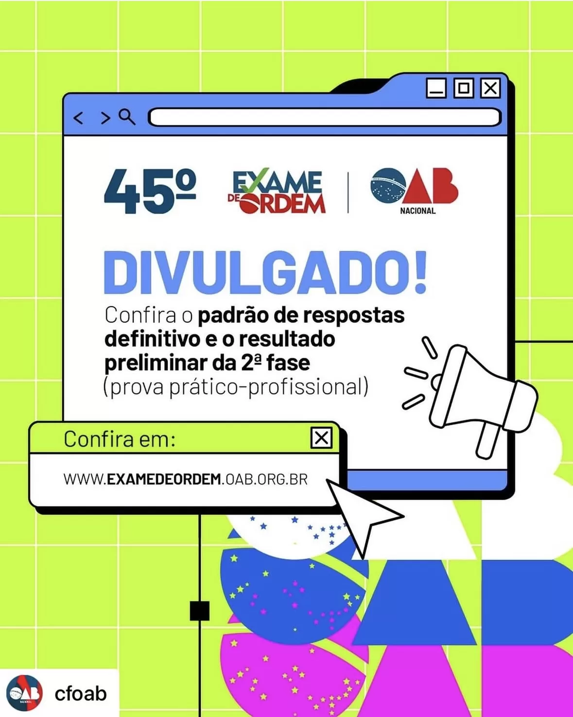 O padrão de respostas definitivo e o resultado preliminar da prova prático-profissional da 2ª fase do 45º EOU já estão disponíveis. ✔️